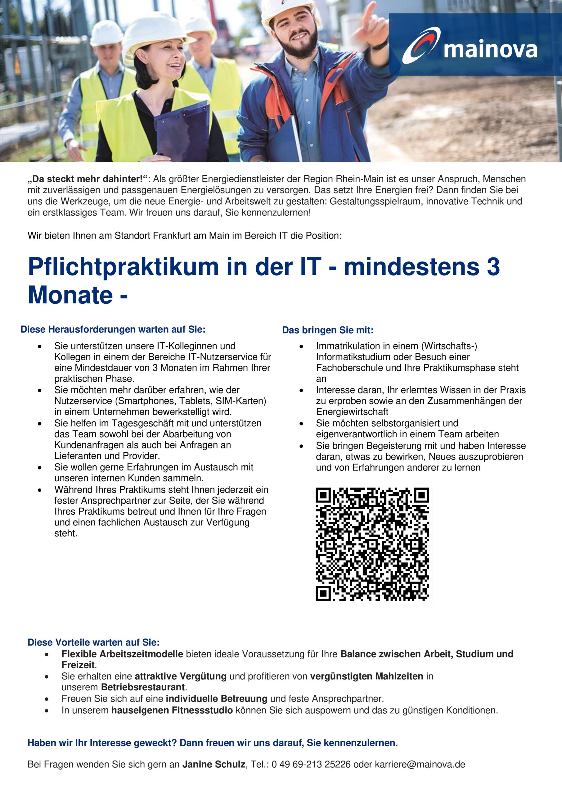 Shaping the energy world of tomorrow together. With innovative projects such as virtual power plants, the storage of green electricity and smart grids, Mainova is facing up to the challenges of the energy transition. In order to fulfil this responsible task, we need energetic employees. Whether trainees or students, graduates, experienced professionals or managers: in your job, we give you confidence and responsibility - and every opportunity to pursue professional goals independently and flexibly. Take a look behind the scenes of the company and get to know us as an employer. Here you will find the job that suits you!